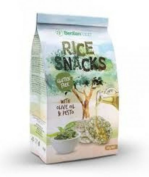 barna rizs 80%, oliva olaj 15%, pesto fűszerek 3% (napraforgóliszt, reszelt sajt, bazsalikom 1%, spenót por, fokhagymapor, só.