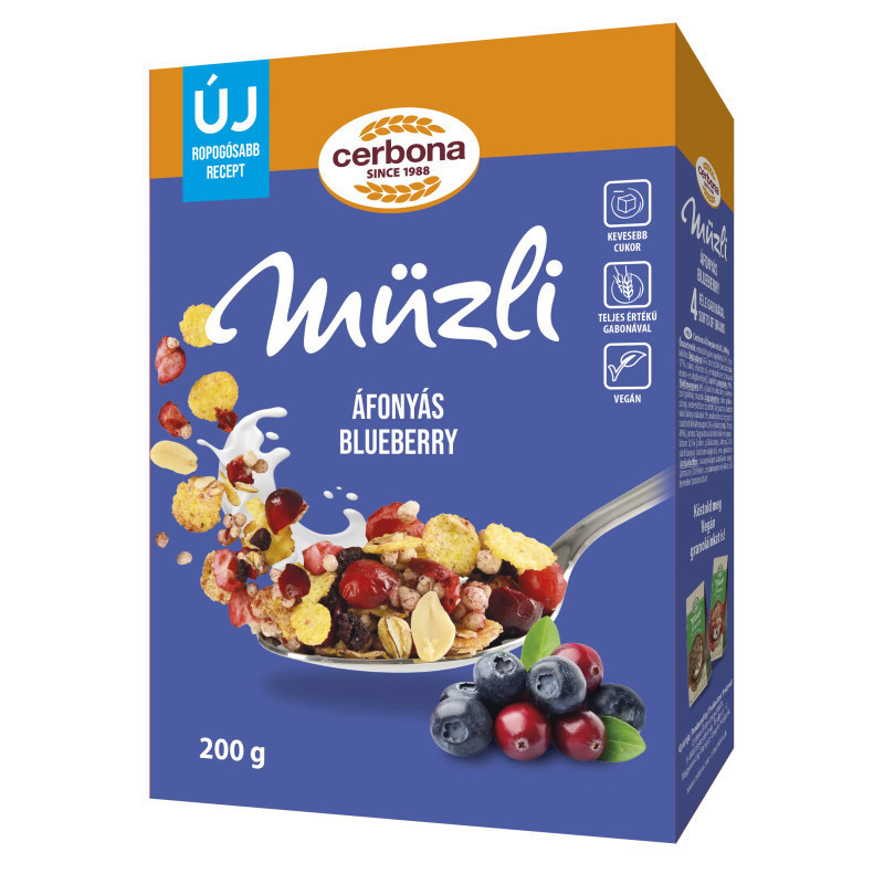 Az áfonyás müzlit a kékáfonya, vörösáfonya, földimogyoró, mazsola, valamint a 4 fajta gabonából készült ropogós gabonapelyhek és a lapított zabpehely teszik ellenállhatatlanul finommá.