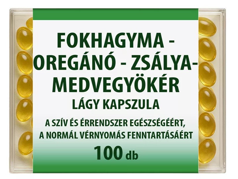 A fokhagyma oregánó zsálya medvegyökér lágy kapszula gondosan összeállított gyógynövény-kivonatokat tartalmaz. Az étrend-kiegészítőben található fokhagyma és oregánó hozzájárul a szív és érrendszer egészséges működéséhez, az oregánó emellett erősíti az ereket és segít normalizálni a vérnyomást. A vörösgyökerű zsálya és a kínai medvegyökér Kínában őshonos gyógynövények.