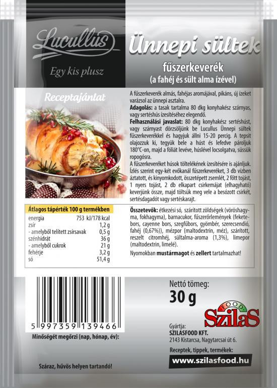 80 dkg konyhakész sertéshúst, vagy szárnyast dörzsöljünk be Lucullus Ünnepi sültek fűszerkeverékkel és hagyjuk állni 15-20 percig. A tepsit olajozzuk ki, tegyük bele a húst és lefedve pároljuk 180°C-on, majd a fóliát levéve, húslével locsolgatva, süssük ropogósra.
