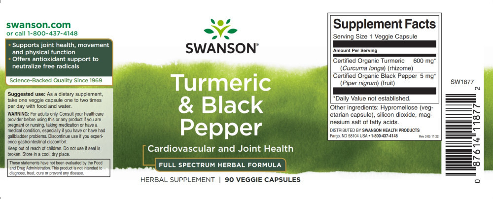 Swanson Turmeric&Black Pepper (Kurkuma+ feketebors) 90 növényi kapszula