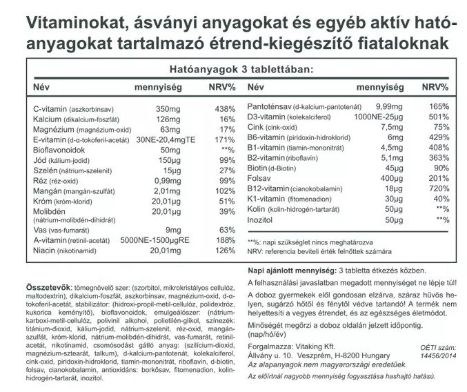 A Vitaking Mega Vitamin Tiniknek készítménye kifejezetten a tini korosztály szervezetének igényei alapján lett összeállítva. Minden fontos vitamint és ásványi anyagot tartalmaz, amivel célszerű kiegészíteni a fejlődésben lévő korosztály mindennapi étrendjét. Az összes szükséges vitamint és ásványi anyagot tartalmazza a tinik számára szükséges mennyiségben.