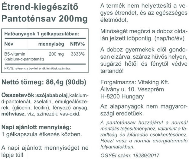 A B5-vitamin részt vesz a normál energiatermelő folyamatokban, hozzájárul a szteroidhormonok, a D-vitamin és egyes ingerületátvivő anyagok normál szintéziséhez és anyagcseréjéhez. Bizonyítottan hozzájárul a fáradtság és a kifáradás csökkentéséhez, a normál mentális teljesítményhez és részt vesz a normál energiatermelő folyamatokban.