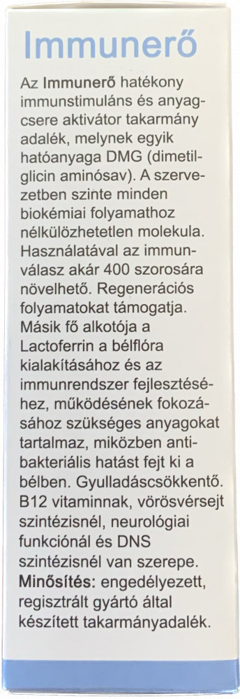 Az Immunerő tehát egy hatékony immunstimuláns és anyagcsere aktivátor takarmányadalék, melynek egyik hatóanyaga a DMG (dimetil glicin aminosav), mely a szervezetben lejátszódó szinte minden biokémiai folyamathoz nélkülözhetetlen molekula. A regenerációs folyamatokat támogatja, s használatával az immunválasz akár négyszázszorosára növelhető! Másik fő alkotója a lactoferrin a bélflóra kialakításához és az immunrendszer fejlesztéséhez, működésének fokozásához szükséges anyagokat tartalmaz, miközben antibakteriális hatást fejt ki a bélben. Gyulladáscsökkentő hatású, s például a vörösvérsejt- és DNS-szintézisnél, neurológiai funkcióknál van szerepe.