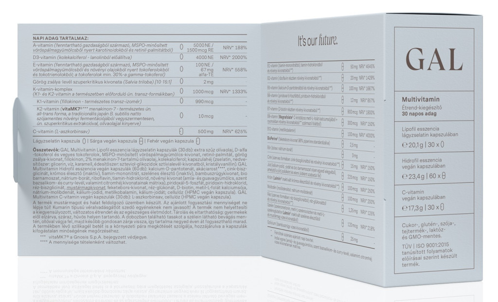 Összetevők: GAL Multivitamin Lipofil esszencia lágyzselatin kapszulák (30 db): extra szűz olívaolaj, D-alfa-tokoferol és vegyes tokoferolok, MSPO-minősített vöröspálmagyümölcs-kivonat, retinil-palmitát, görög zsálya-kivonat, fillokinon, 2% menakinon-7-tartalmú olívaolaj, kolekalciferol; kapszulahéj (zselatin, nedvesítőszer: glicerin, víz, karamell, édesítőszer: szteviol-glikozidok sztívialevél-kivonatból, kristályvanillin).