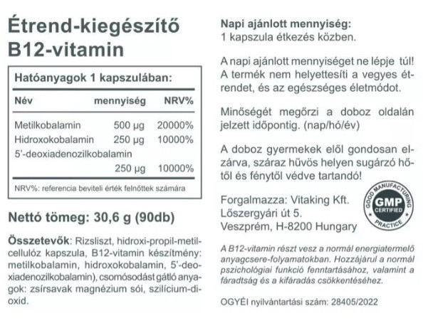 B-12 vitamin természetben előforduló összetevőkkel. Termékünk 500µg metilkobalamint 250mg hidroxokobalamint és 250mg 5’-deoxiadenozilkobalamint tartalmaz kapszulánként. (a B12 természetben előforduló formái) A B12 vitamin részt vesz a normál energiatermelő anyagcsere-folyamatokban, hozzájárul az idegrendszer normál működéséhez, a normál vörösvérsejt-képző?déshez és az immunrendszer normál működéséhez.
