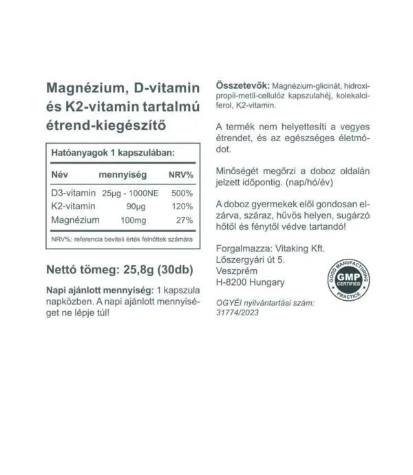 A Vitaking MagneTrio egy olyan kiváló minőségű komplex készítmény, ami nagy mennyiségben tartalmaz magnézium biszglicinátot, D3 és K2 vitamint. A K2 vitamint Menakinon-7 (MK7, all-trans) formában tartalmazza, ami egy természetes, kiválóan hasznosuló K2-vitamin forma. 100mg magnézium biszglicinát, 1000NE D3-vitamin és 90μg K2 vitamin egy kapszulában!