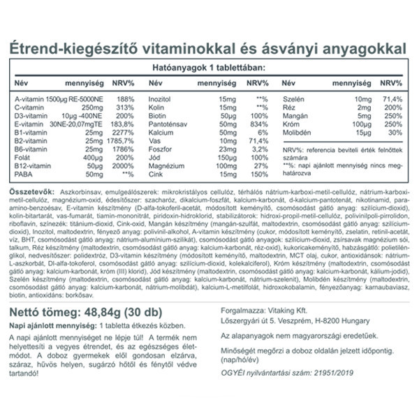 Rengeteget dolgozol? Állandóan rohansz, és a sok teendőtől túlhajszoltnak érzed magad? Ha a rohanó életmód mellett nem fogyasztasz elegendő mennyiségű értékes tápanyagot (vitamin, ásványi anyag), sajnos nem fog javulni ez a helyzet. Emiatt szükséges, hogy minőségi tápanyagokkal egészítsd ki az étrended. Ennek jegyében született meg ez a multivitamin, amit minden 14-60 év közötti felnőttnek ajánlunk. Az új, megújult forma a B-12 vitamint hidroxi-kobalamin formában tartalmazza, ami a B12 aktív és természetes formája, illetve a folsavat folát formában, ami folsav természetben előforduló formája.