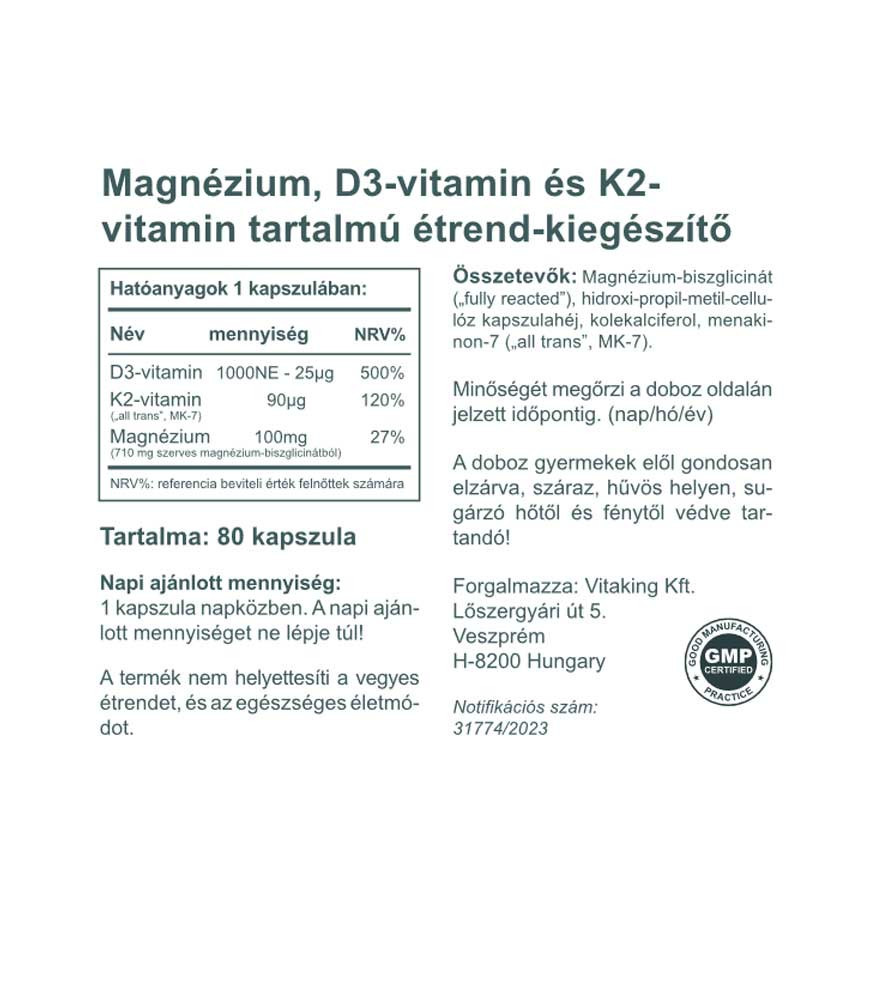 A Vitaking MagneTrio egyetlen kapszulában kiváló minőségben és nagy mennyiségben tartalmaz 3 fontos tápanyagot – magnéziumot, K2-vitamint és D3 vitamint!