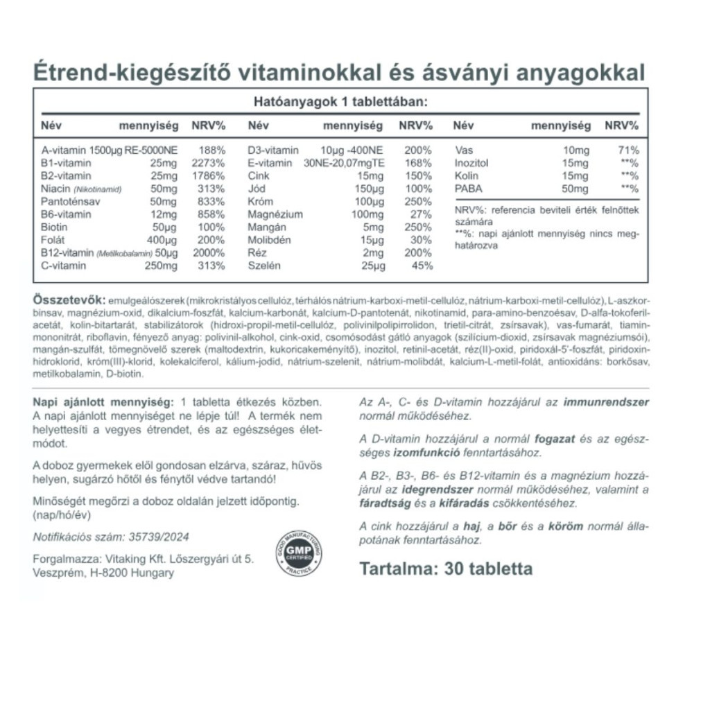 Rengeteget dolgozol? Állandóan rohansz, és a sok teendőtől túlhajszoltnak érzed magad? Ha a rohanó életmód mellett nem fogyasztasz elegendő mennyiségű értékes tápanyagot (vitamin, ásványi anyag), sajnos nem fog javulni ez a helyzet. Emiatt szükséges, hogy minőségi tápanyagokkal egészítsd ki az étrended. Ennek jegyében született meg ez a multivitamin, amit minden 14-60 év közötti felnőttnek ajánlunk. Az új, megújult forma a B-12 vitamint hidroxi-kobalamin formában tartalmazza, ami a B12 jól hasznosuló és természetes formája, illetve a folsavat folát formában, ami folsav természetben előforduló formája.