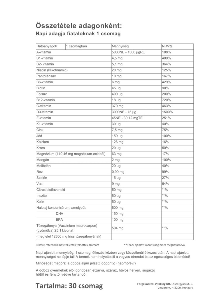 Minden doboz tartalmaz 30 kényelmesen hordozható zacskót, ami minden létfontosságú vitamint és ásványi anyagot és egyéb tápanyagokat tartalmaz optimális formában. Minden napi multivitamin csomag tartalmazza az alábbi 4 készítményt: