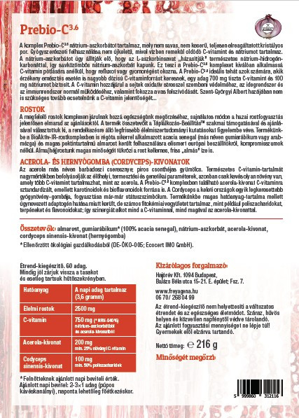 Az acerola más néven barbadoszi cseresznye; piros csonthéjas gyümölcs. Természetes C-vitamin-tartalmát nagymértékben befolyásolják az élőhelyi, termesztési és genetikai paraméterek, azonban csak kevés olyan növény van, amely több C-vitamint tartalmazhat, mint az acerola. A Prebio-C3.6 komplexben található acerola-kivonat C-vitaminra sztandardizált, emellett karotinoidok és bioflavonoidok forrása is. A Cordyceps a keleti országok egyik legkeresettebb gyógynövény-gombája, fogyasztása már-már státuszszimbólum. Termékünkbe magas hatóanyag-tartalma mellett úgynevezett adaptogén hatása miatt került, de számos fitokémiai vegyületet tartalmaz, mint például poliszacharidokat, terpéneket és flavonoidokat; így szinergiát alkot mind a C-vitaminnal, mind magával az acerola-kivonattal.