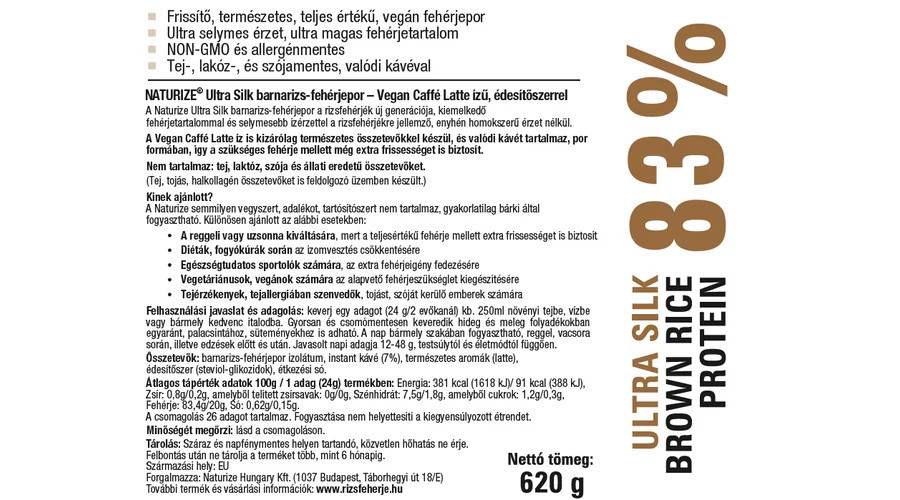A vegan caffé latte ízesítésű Naturize® Ultra Silk is kizárólag természetes összetevőket tartalmaz, prémium barnarizs-fehérjeport, holland instant bio kávét, természetes latte aromát, egy kevés Stevia levél kivonatot és pár szem Himalája sót. Gluténmentes, tejet, laktózt, szóját, aszpartamot, állati eredetű összetevőt nem tartalmaz.