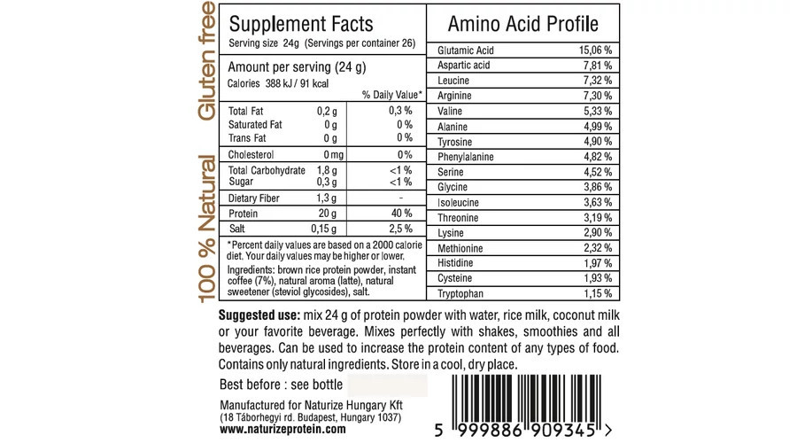 A Vegan Caffé Latte ízesítésű Naturize® is kizárólag természetes összetevőket tartalmaz, Naturize barnarizs-fehérjét, holland instant bio kávét, természetes latte aromát, egy kevés Stevia levél kivonatot és pár szem Himalája sót. Gluténmentes, tejet, laktózt, szóját, aszpartamot, állati eredetű összetevőt nem tartalmaz.