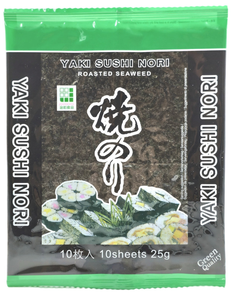 Ez a yaki-nori 10 db egyenletes felületű és vastagságú, szárított és pirított, nagyjából 18*20 cm-es, kiváló minőségű algalapot tartalmaz.