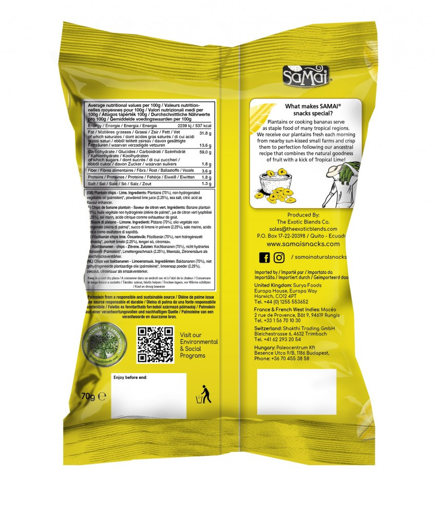 A SAMAI Plantain chips prémium minőségű főzőbanánból készül, melyet Dél-Amerika csendes-óceáni partján, Ecuadorban helyi farmerek termesztenek.