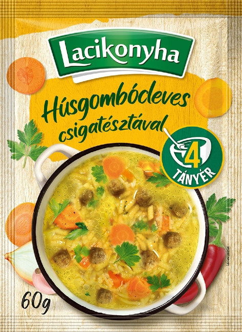A Húsgombócleves csigatésztával nem tartalmaz tartósítószert és 4 tányérnyi adag.