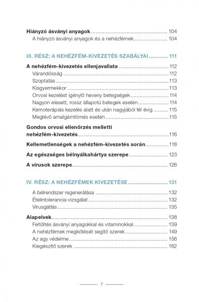 A könyvben a nehézfémek veszélyein túl a kivezetés gyakorlati kérdéseire is választ kap az olvasó, végigvesszük a szükséges ásványi anyagokat, azok pótlási lehetőségeit, a kivezetéshez valóban hasznos módokat, gyógynövényeket, szereket.