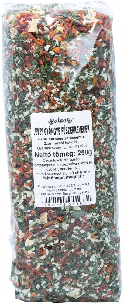 Összetevők: sárgarépa, vöröshagyma, petrezselyemlevél és gyökér, paszternák, paradicsompehely, póréhagyma