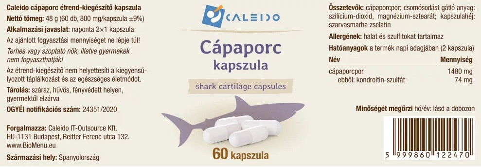 A Caleido CÁPAPORC kondroitin-szulfát tartalma az ízületek porcainak alapvető összetevője. A cápaporcanyagai segíthetnek az ízületek megfelelő működésében, a gyulladáscsökkentésben, a regenerálódásban,a fájdalomcsökkentésben.