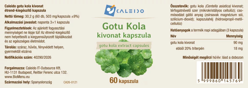 A Caleido Gotu Kola kivonat kapszula egy növényi alapú étrend-kiegészítő, amely a gotu kola (Centella asiatica) kivonatát tartalmazza. Ez a növény évszázadok óta ismert a hagyományos felhasználásban, és napjainkban is népszerű összetevője a tudatosan összeállított étrend-kiegészítőknek.
