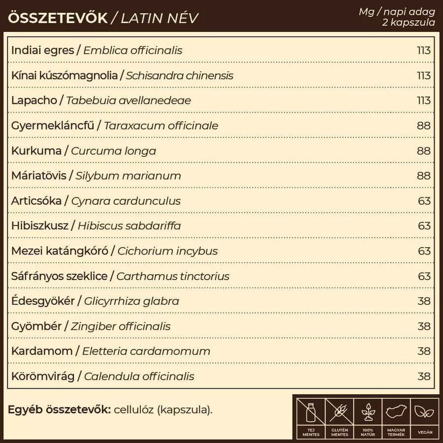 A gyógynövény-komplex jótékony hatásai többek között:- tisztítja és regenerálja a májsejteket,