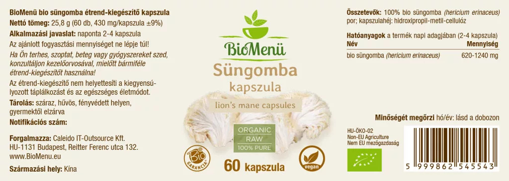 100% bio süngomba (hericium erinaceus) por; kapszulahéj: hidroxipropil-metil-cellulóz