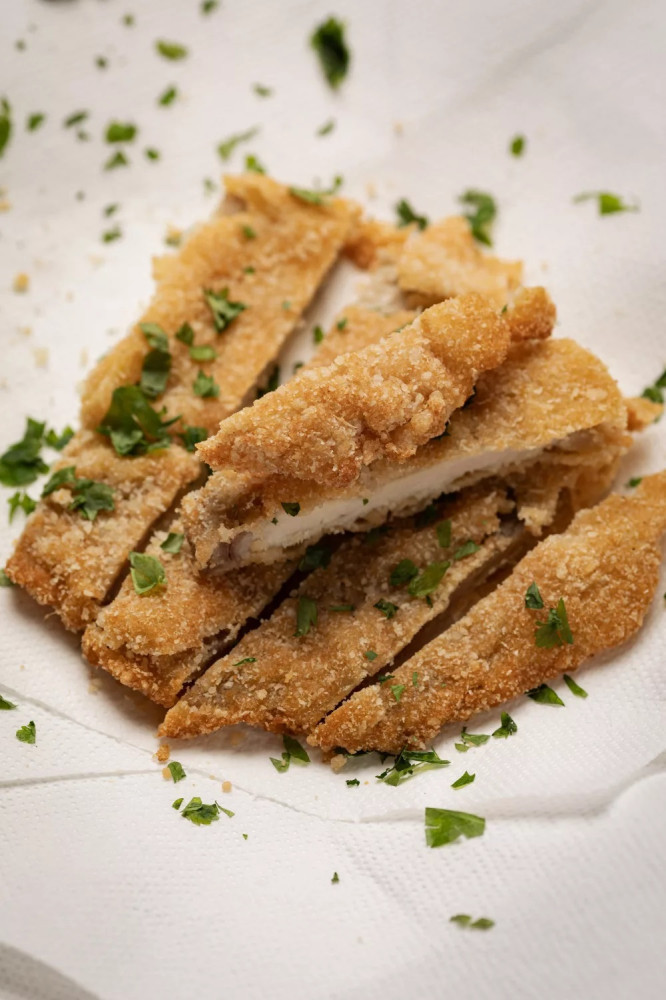 a sózott, borsozott húst gluténmentes (paleo) lisztbe (pl. szezámliszt, mandulaliszt, tápióka liszt) forgatjuk, felvert tojásba mártjuk, majd megforgatjuk a ropogós panírmorzsában és zsiradékban készre sütjük (először pár perc alatt nagy fokozaton, majd mérsékelve). A hagyományos panírnál kicsit világosabbra sül. Apróbb, finomabb szemcséhez kávédarálón őröld le kicsit