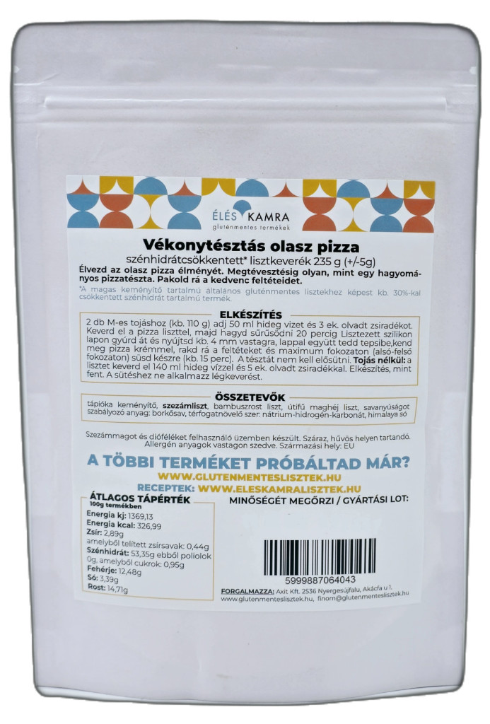 - 1 csomag Éléskamra Vékony tésztás olasz pizza szénhidrát csökkentett* lisztkeverék