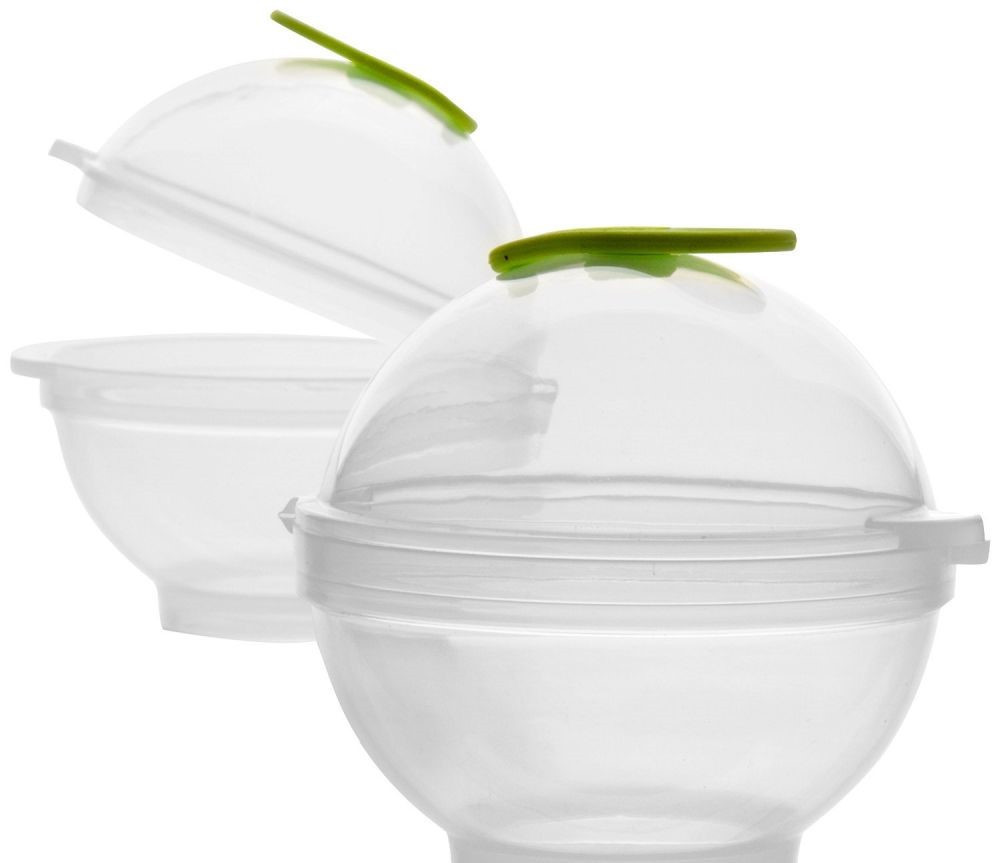 2db műanyag, 7,5cm átmérőjű jéggömb készítő forma készlet. A műanyag formákba tehetünk gyümölcs levet, gyümölcsöt, menta vagy citromfű levelet és ezt töltjük fel a forma tetején levő nyíláson keresztül vízzel, úgy hogy hagyunk a formában helyet a tágulásnak. A hatalmas jég gömbök látványosak a limonádéban és hosszan hűtik.