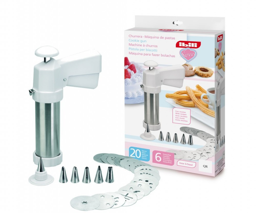 Rozsdamentes fém keksz, linzer és chorros nyomó és díszítő készlet avagy kekszgyár műanyag fogóval tartalmaz egy 25cm-es kinyomó pisztolyt, 20db különféle mintázatú 5cm átmérőjű, fémből készült keksz avagy linzer mintázót, valamint 6 ugyancsak fém, díszítő csövet. Mosogatógépben mosható.