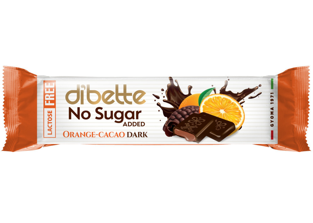 • Narancsos-kakaós krémmel töltött étcsokoládé szelet hozzáadott cukor nélkül, édesítőszerrel, xilittel és szteviával.