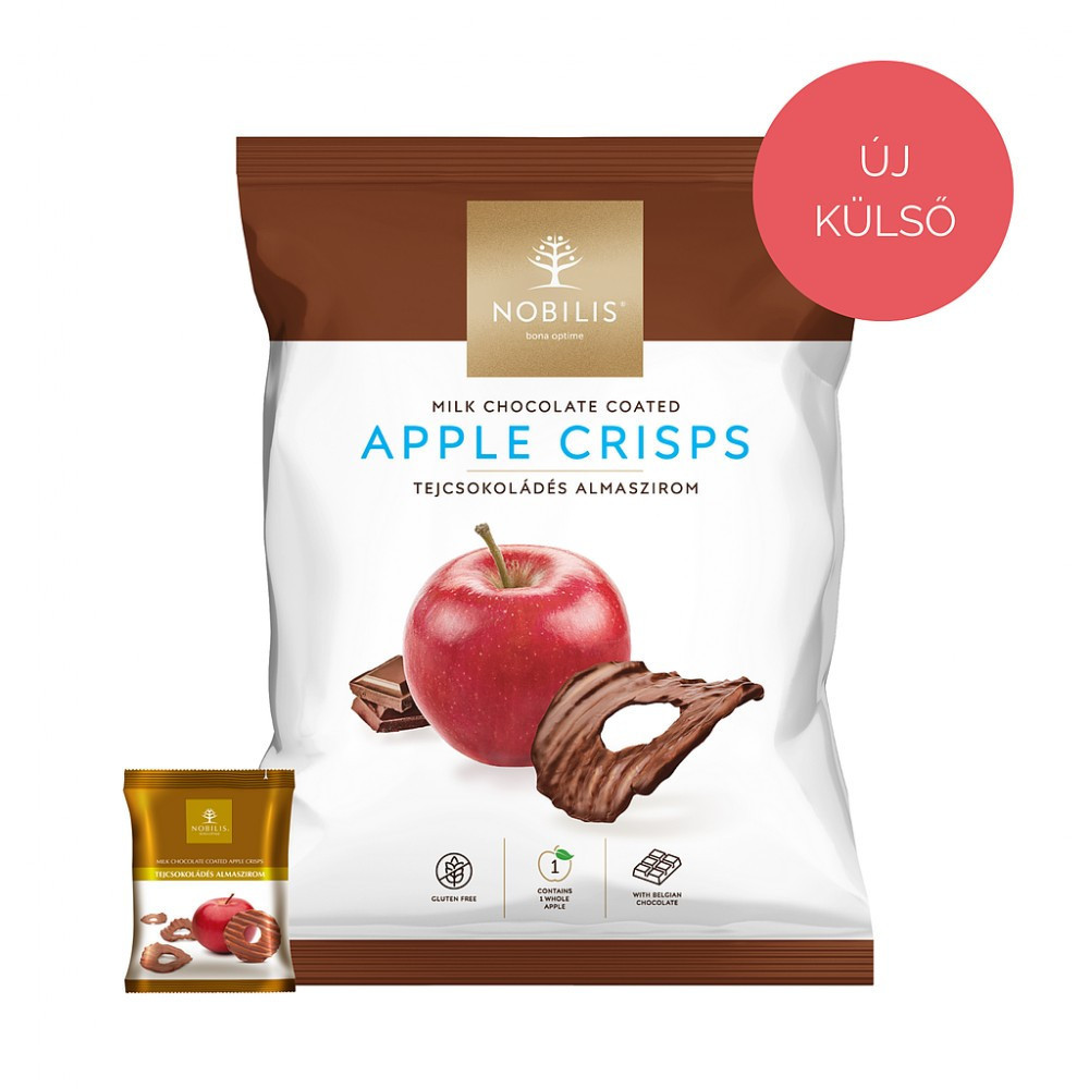 tejcsokoládé (min.60%) [cukor, kakaóvaj, kakaómassza, zsíros tejpor, emulgeálószer (szójalecitin), természetes vanília aroma)], jonatánalma, antioxidáns (citromsav).