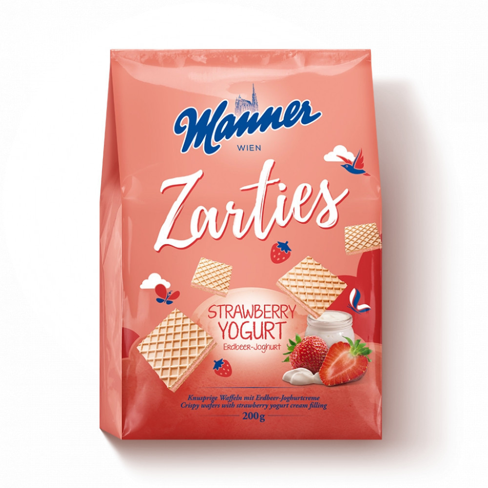 Az új Strawberry Yogurt Zarties egész évben nyáriasan friss ízélményt nyújt. A Zarties ellenállhatatlan ízéről két ropogós, ugyanakkor lágy Manner ostyaszelet és a könnyű eperkrém töltelék gondoskodik. A lágy joghurtíz tökéletesen harmonizál a finom és természetes eperízzel – e párosítás gondoskodik a különösen gyümölcsös élvezetről.