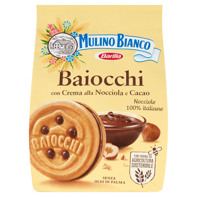 Barilla Mulino Bianco Baiocchi mogyorós és kakaós krémmel töltött édes keksz.