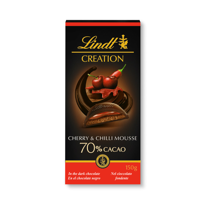 - Csokoládé-habbal (26%), meggy-krémmel és chili-krémmel (18%) töltött keserű csokoládé.