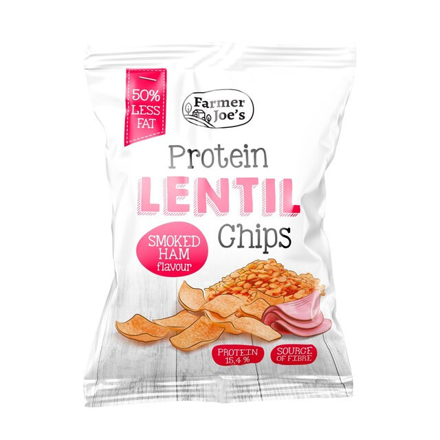Farmer Joe fehérjében gazdag lencsechips füstölt sonkával vegán, ropogós, több fehérjét és kevesebb zsírt tartalmaz.